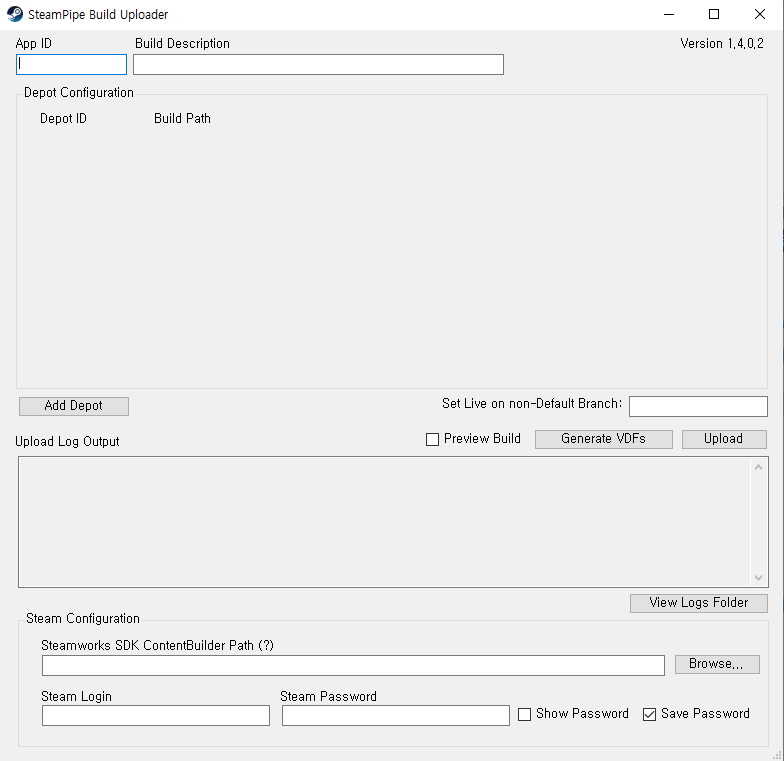 이 프로그램으로 Steamworks 로 게임 빌드파일을 업로드 할 수 있습니다.